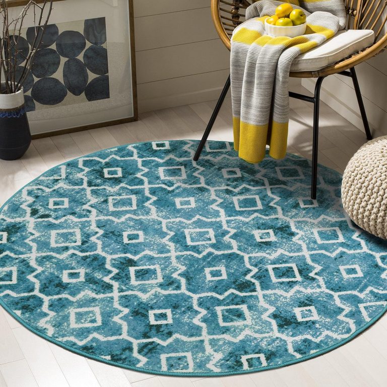 Washable Round Area Rug – Teal 3ft Small Round Rug Non-Slip Distressed Bedroom Rug Accent Soft Door Mat Modern Geometric Trellis Throw Carpet for Sink Entryway Nursery
